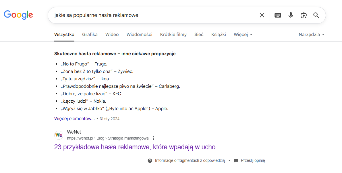 Dopiero później warto dodać rozwinięcie. Taka forma ułatwia dostarczanie precyzyjnych odpowiedzi i zwiększa szansę na pojawienie się w Featured Snippets (wyróżnione fragmenty na samej górze strony wyników wyszukiwania).