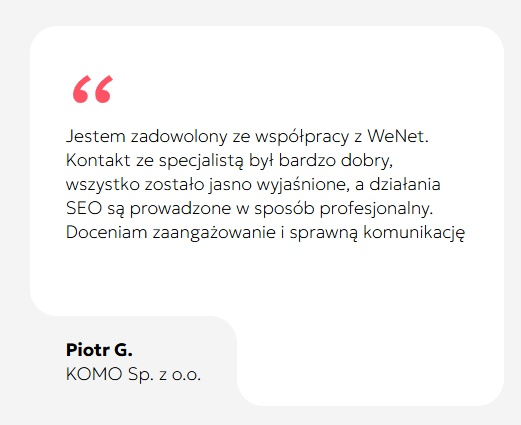 Dobrą praktyką jest prezentowanie opinii nie tylko w Google, ale również na własnych kanałach. Spójrz na przykład firmy WeNet – na dedykowanej podstronie Opinie klientów zebrano autentyczne głosy osób, które skorzystały z usług ekspertów. Oto przykład jednego z nich: