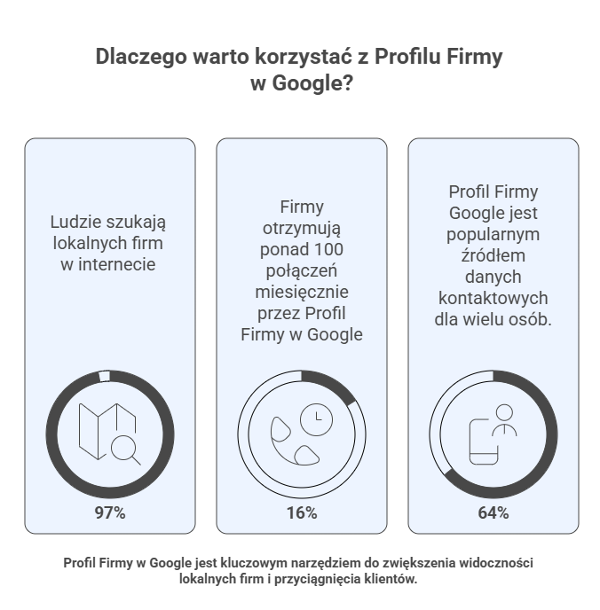Jeśli więc zależy Ci na realnej widoczności w sieci to pamiętaj, że dopiero dobrze uzupełniony Profil Firmy w Google zwiększa szansę, że Twoja firma zostanie znaleziona przez lokalnych klientów i wybrana spośród konkurencji.