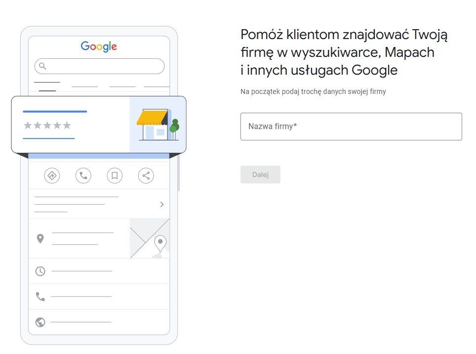 Na tym etapie Google poprosi Cię o podstawowe dane, takie jak nazwa firmy, rodzaj prowadzonej działalności, itp. To moment, w którym faktycznie rozpoczyna się procedura dodania miejsca do systemu Google Maps i możesz jednocześnie rozpocząć tworzenie wizytówki w Profilu Firmy, która będzie widoczna dla użytkowników Google Maps. To także Twój pierwszy realny krok do lokalnej widoczności.