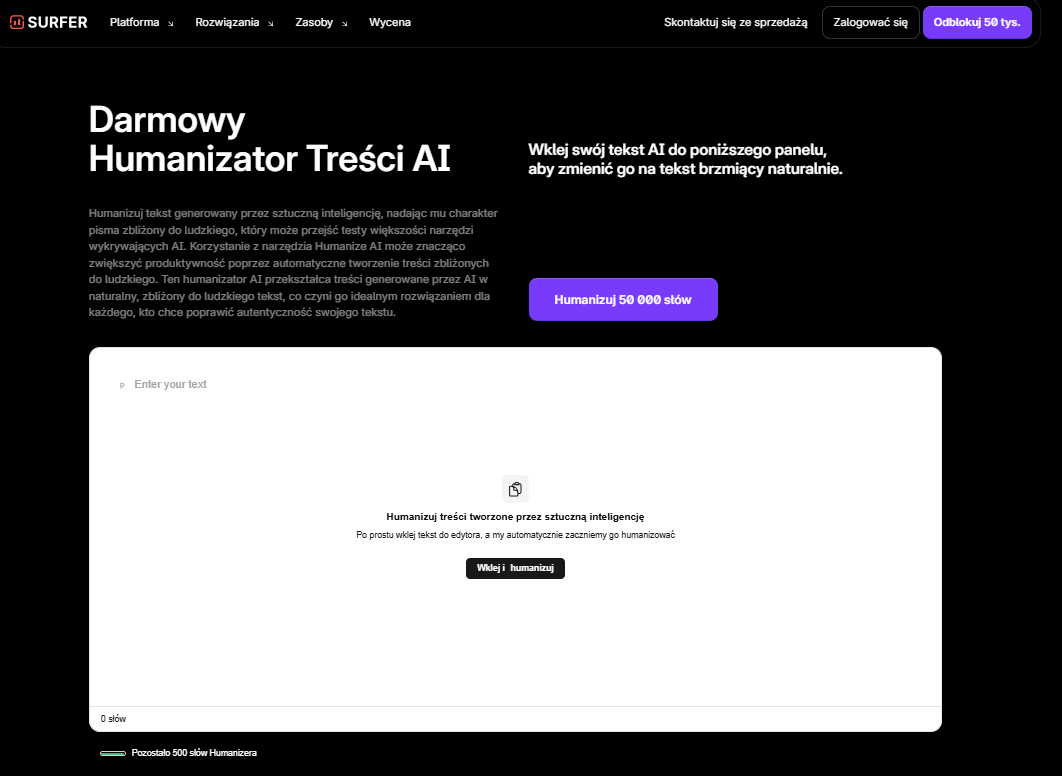 W kontekście trendów w pozycjonowaniu i AEO warto wspomnieć, że Surfer SEO rozwija mozliwości analizy intencji użytkowników. Wprowadził też funkcję Humanize AI, która pozwala przekształcać teksty generowane przez silniki odpowiedzi w bardziej naturalnie brzmiące artykuły, posty itd. Dzięki temu treści zachowują strukturę dostosowaną do strategii pozycjonowania, ale tracą „robotyczny” ton, co sprawia, że są przyjemniejsze w odbiorze dla czytelnika.