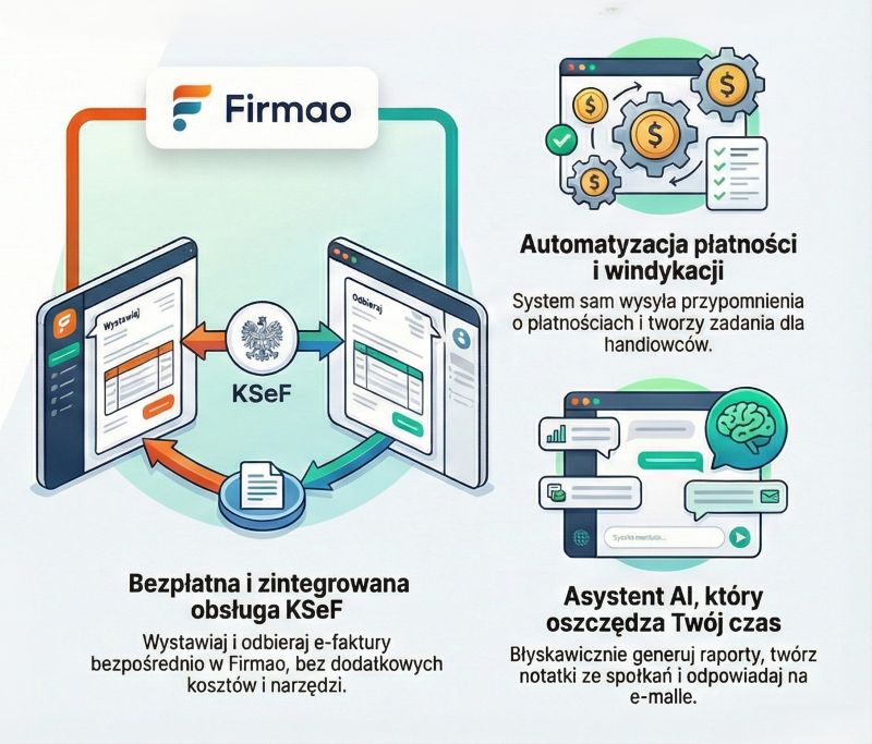 Dobrze też, jeśli dodatkowo, oprócz systemu generowania faktur do KSeF, oferuje również inne, praktyczne i pomocne funkcje w prowadzeniu firmy, takie jak wbudowany asystent AI czy automatyzacje mailingów.