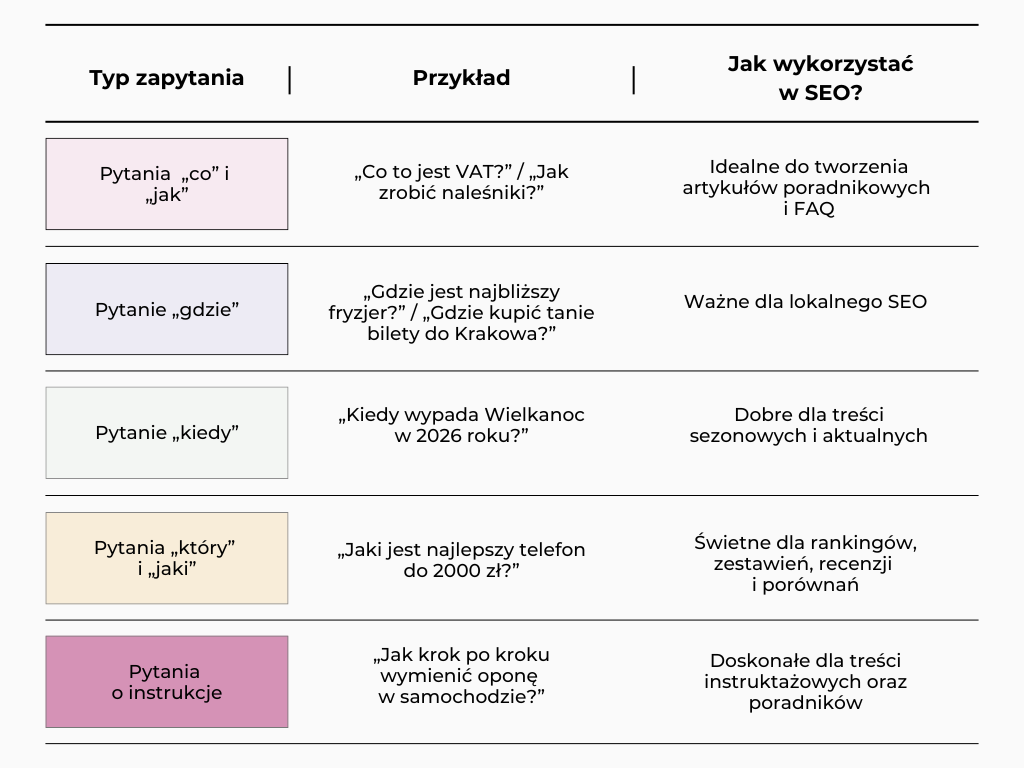 Co to oznacza w praktyce? Musisz przewidywać pełne pytania, które ludzie mogą wypowiadać. Zamiast skupiać się tylko na haśle „dentysta Kraków”, pomyśl o frazach typu: