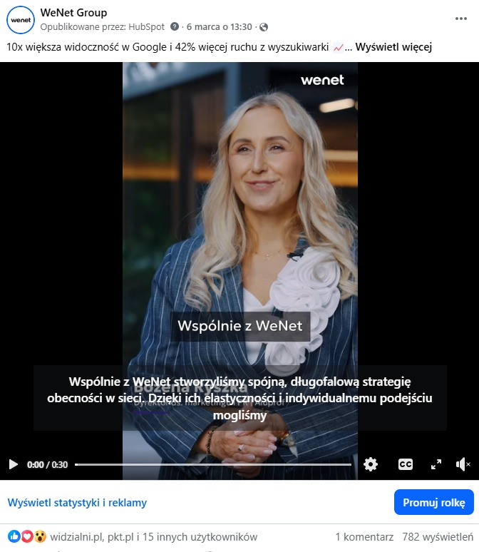 Przykład postu (rolki) na profilu firmowym WeNet Group na Facebooku